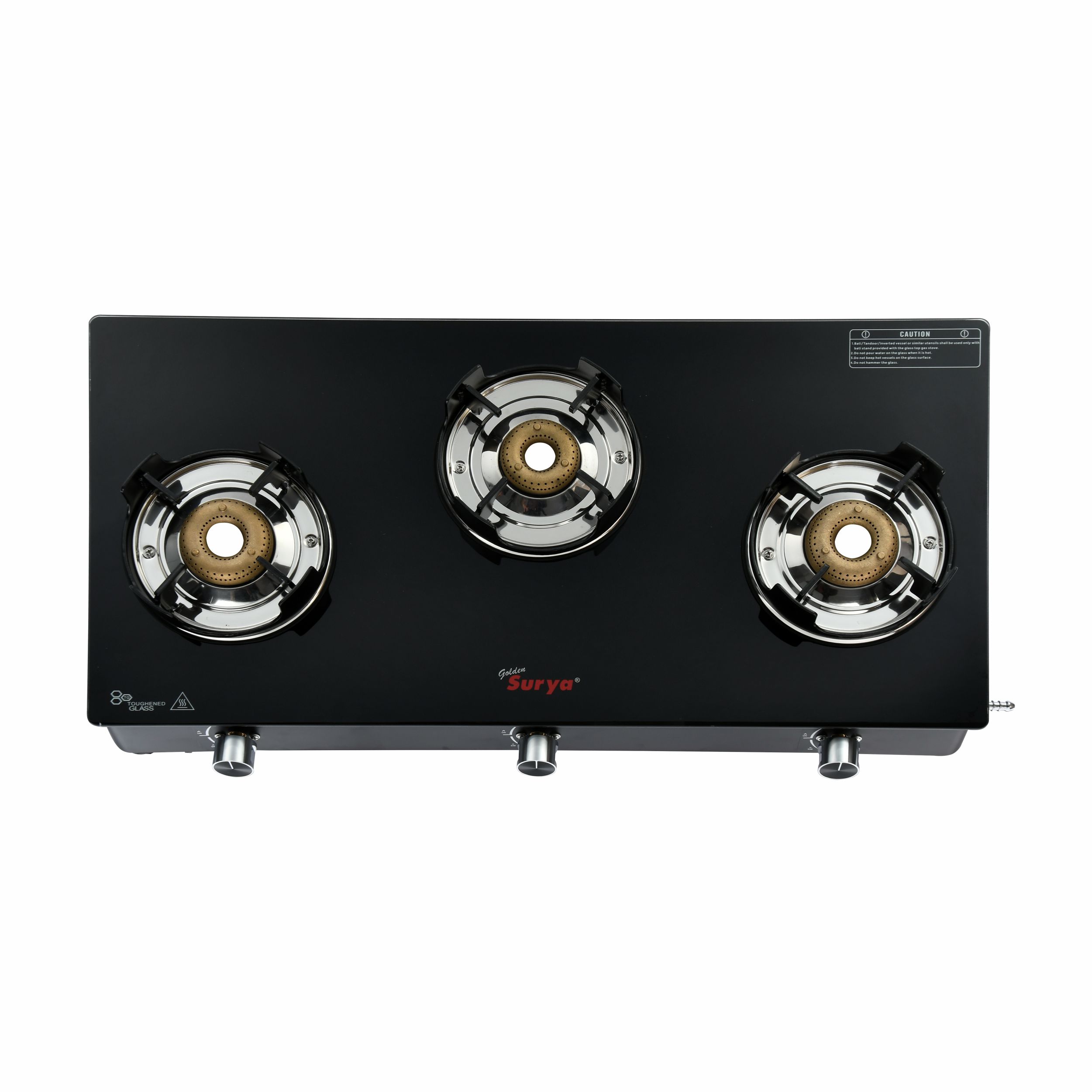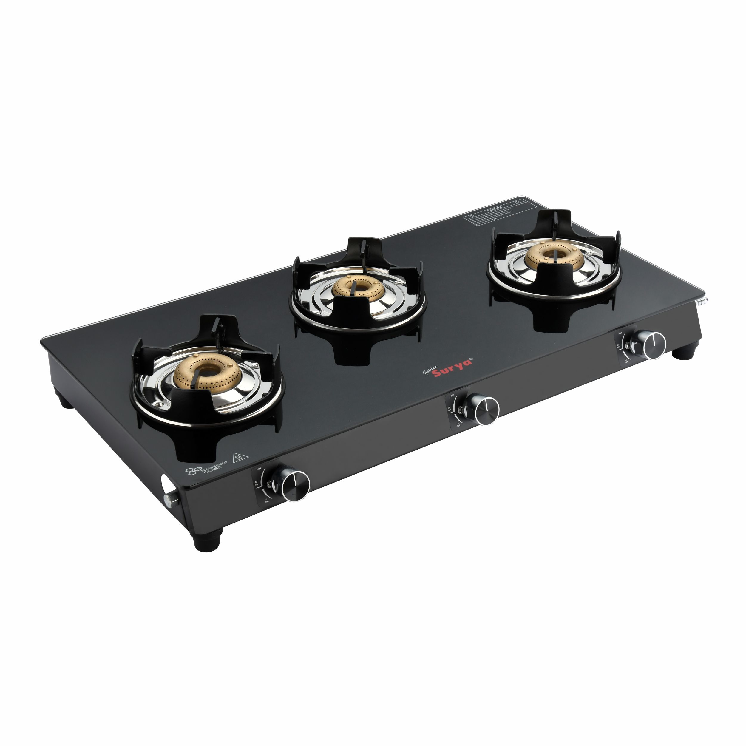 HIGH-EFFICIENCY BRASS BURNERS: The stove is equipped with 3 high-efficiency brass burners—2 big and 1 small—designed for faster and even cooking. Brass material ensures durability, better thermal efficiency, and consistent performance across all burners.