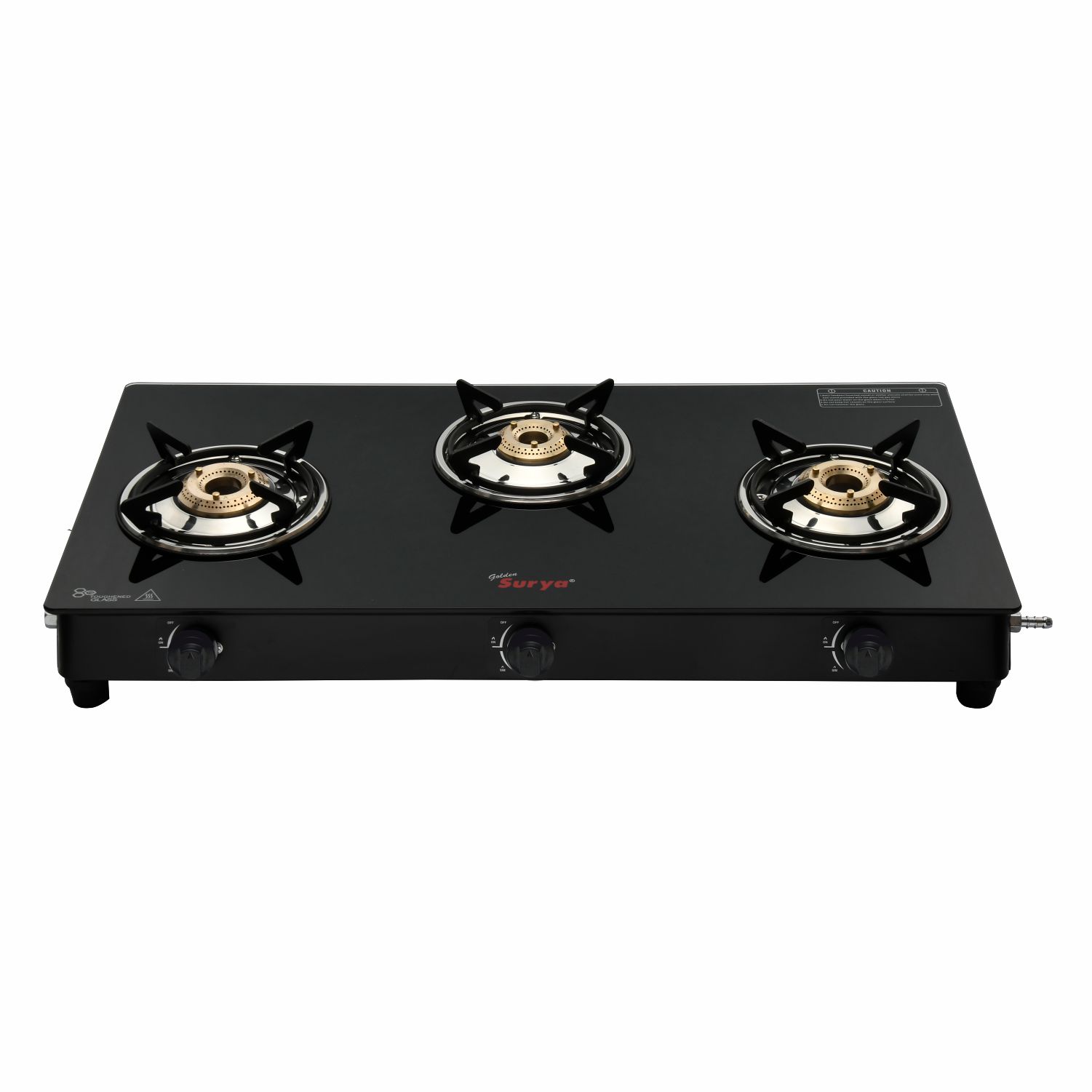 TRI-PIN BRASS BURNERS: Equipped with 3 high-efficiency brass burners (2 Medium and 1 Small), Golden Surya Gas Stove ensures fast cooking and fuel saving. Designed to provide even heat distribution, ensuring that your food is cooked evenly and thoroughly.