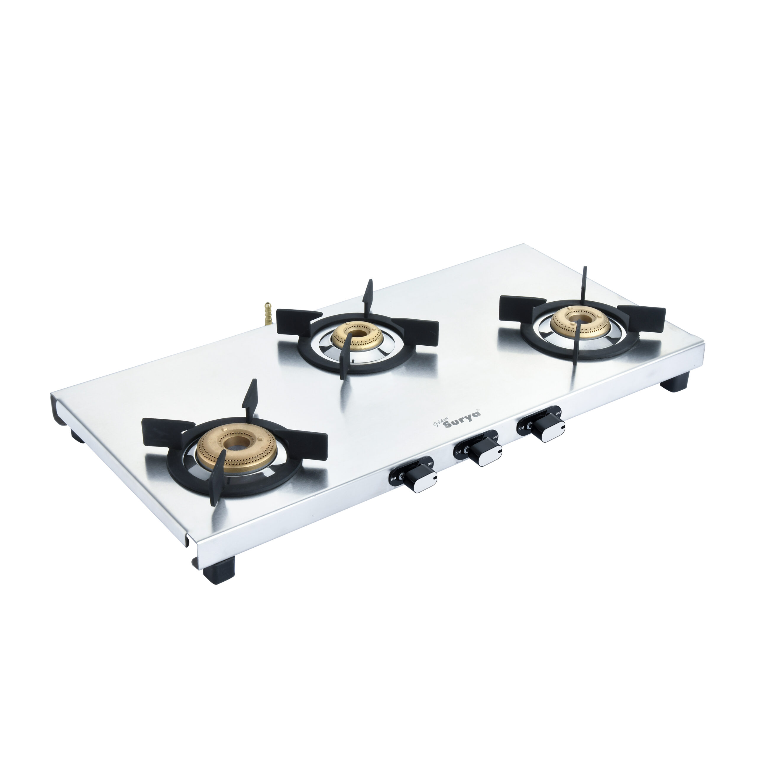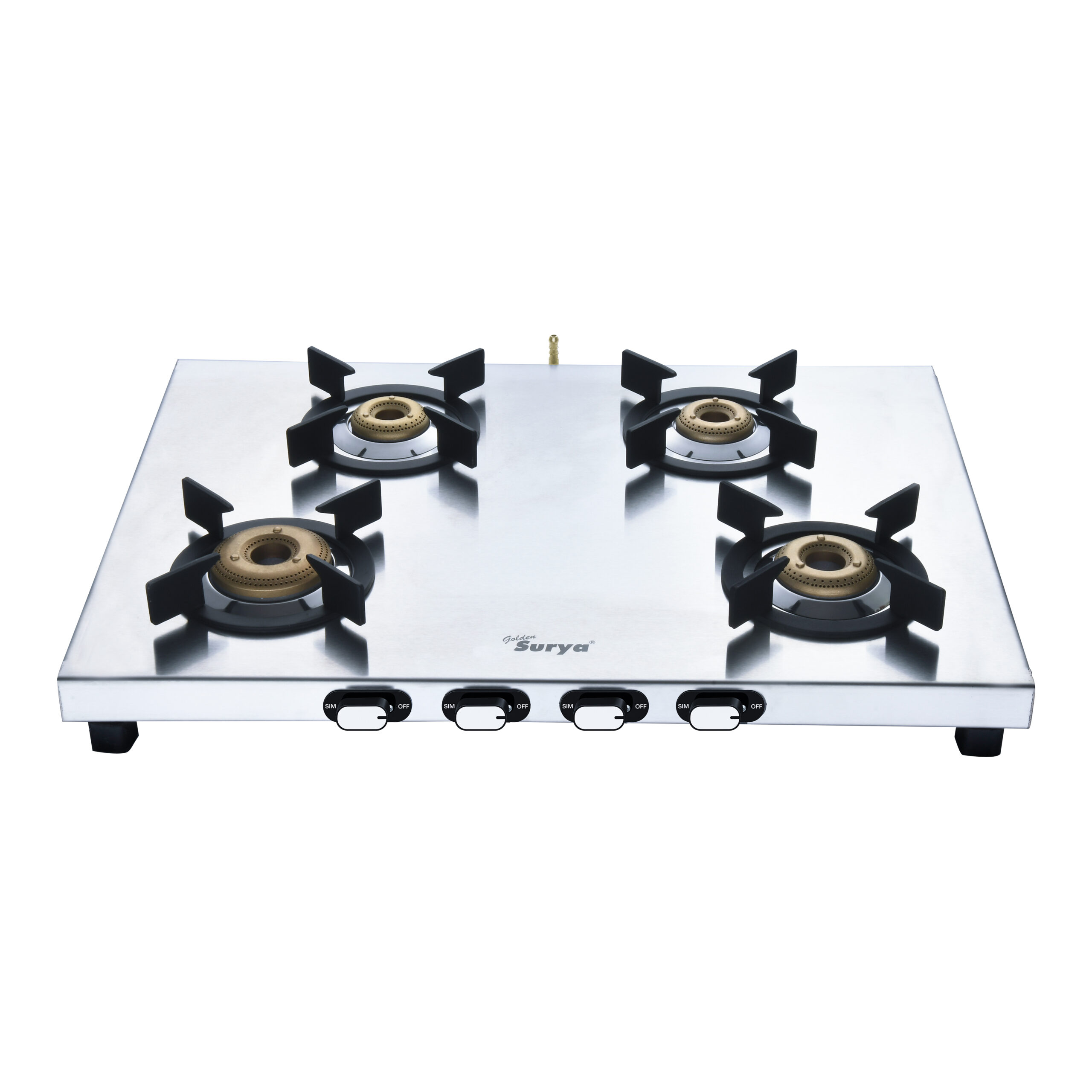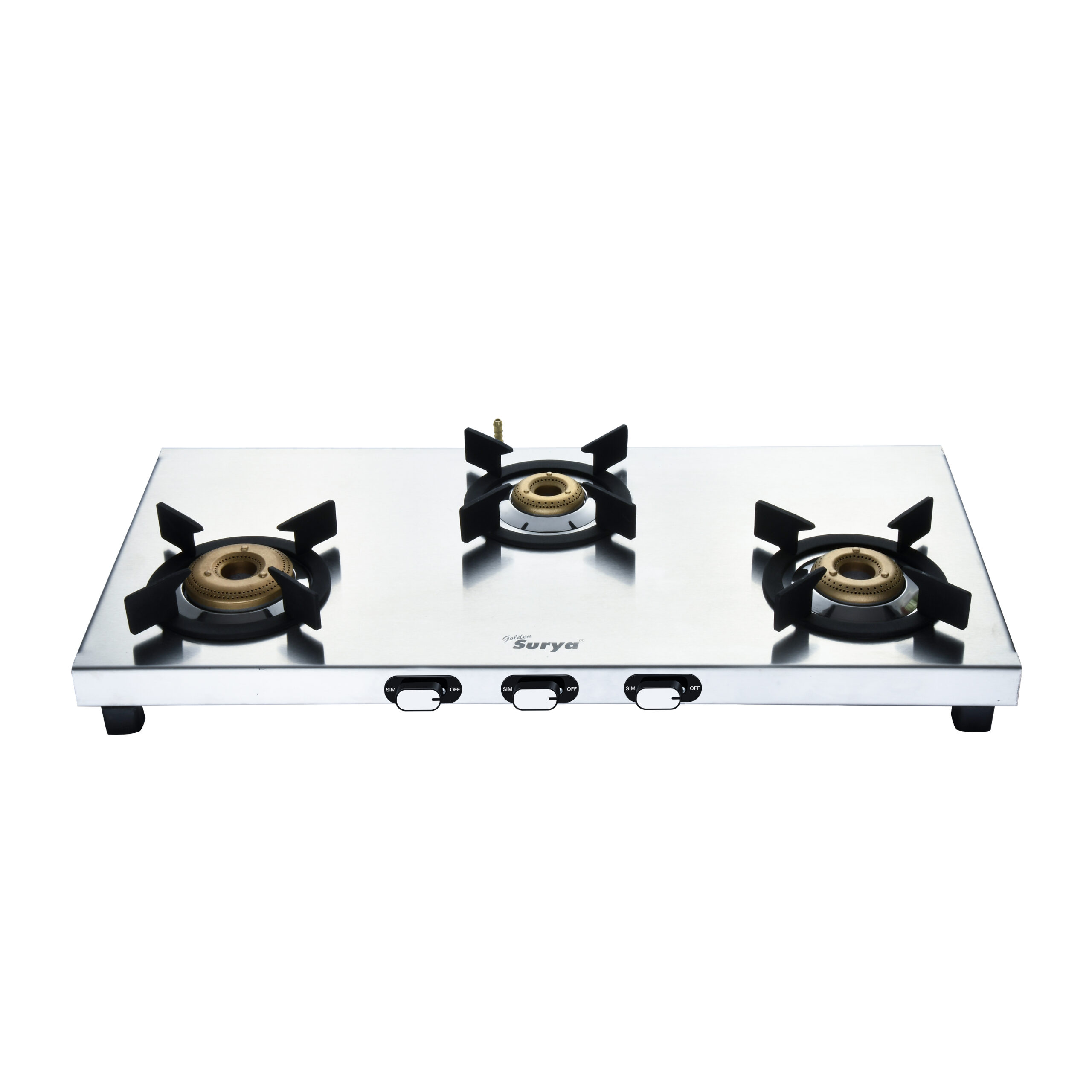 FORGED BRASS BURNERS: Equipped with 3 and 4 heavy-duty forged brass burners, Golden Surya Gas Stove ensures high thermal efficiency and long-lasting performance. Ideal for consistent and even flame distribution.